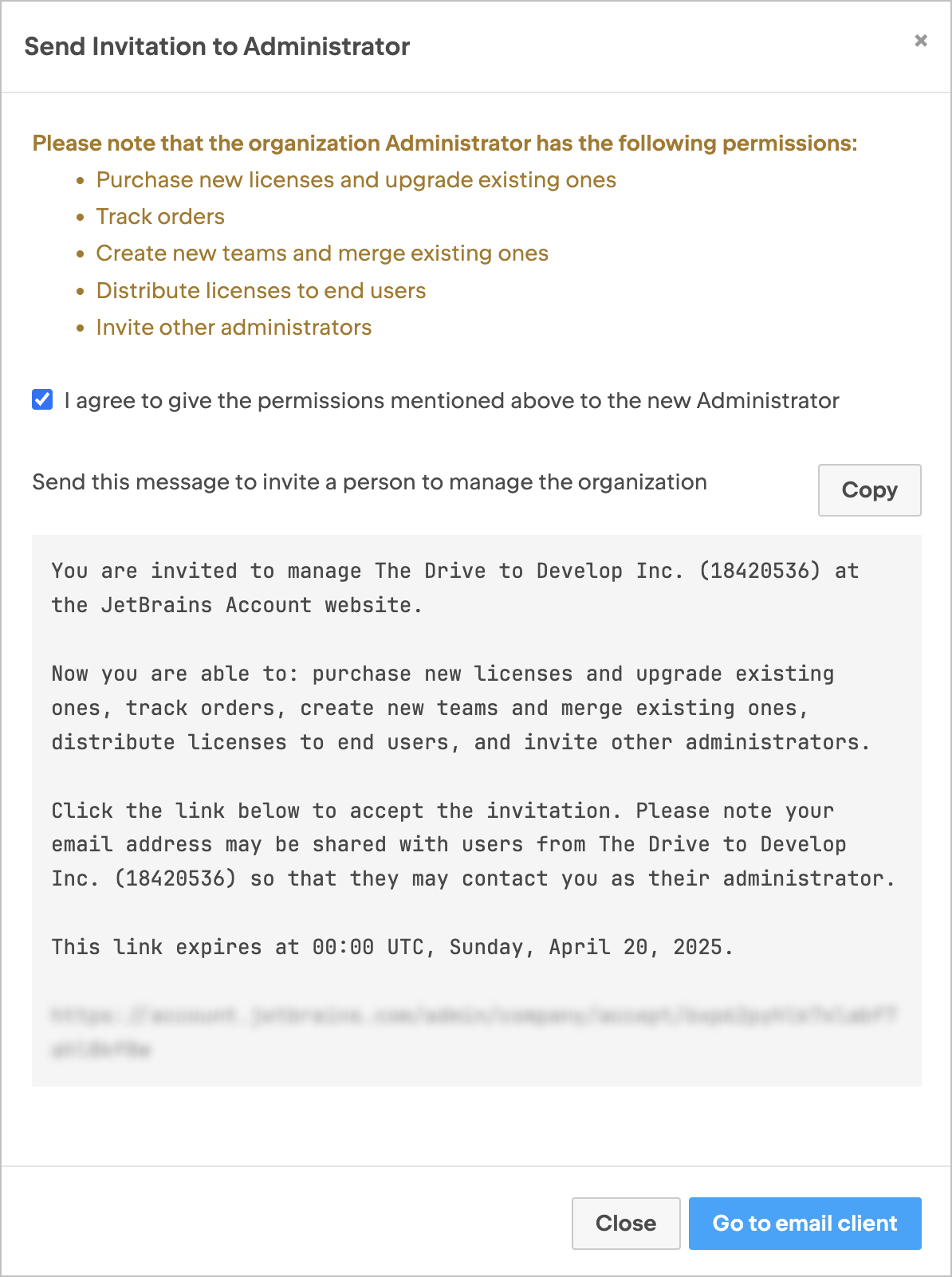 You’ll see the invitation text. Click Copy to copy it to your clipboard, or select Go to email client to open it in your default email app. You can then share the invitation via email, instant messaging, or any other method you prefer.
