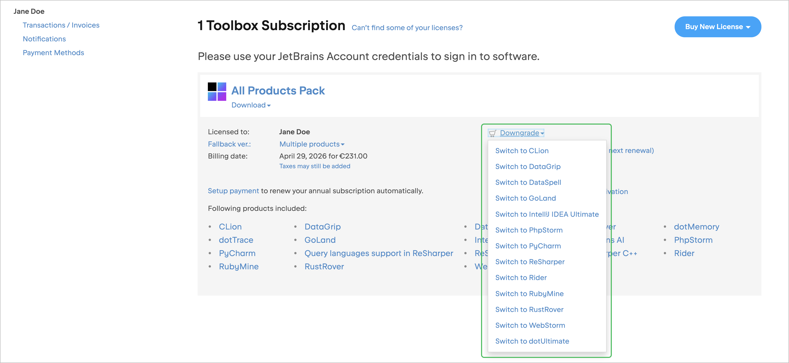 Si vous êtes abonné à un seul IDE ou à un seul outil .NET, vous pouvez passer à une offre groupée qui l’inclut : le pack All Products pour les IDE ou dotUltimate pour les outils.NET. Selon votre produit, d’autres options de mise à niveau peuvent être disponibles. Pour voir la liste complète, consultez la section Options disponibles pour mettre à niveau ou rétrograder votre abonnement.