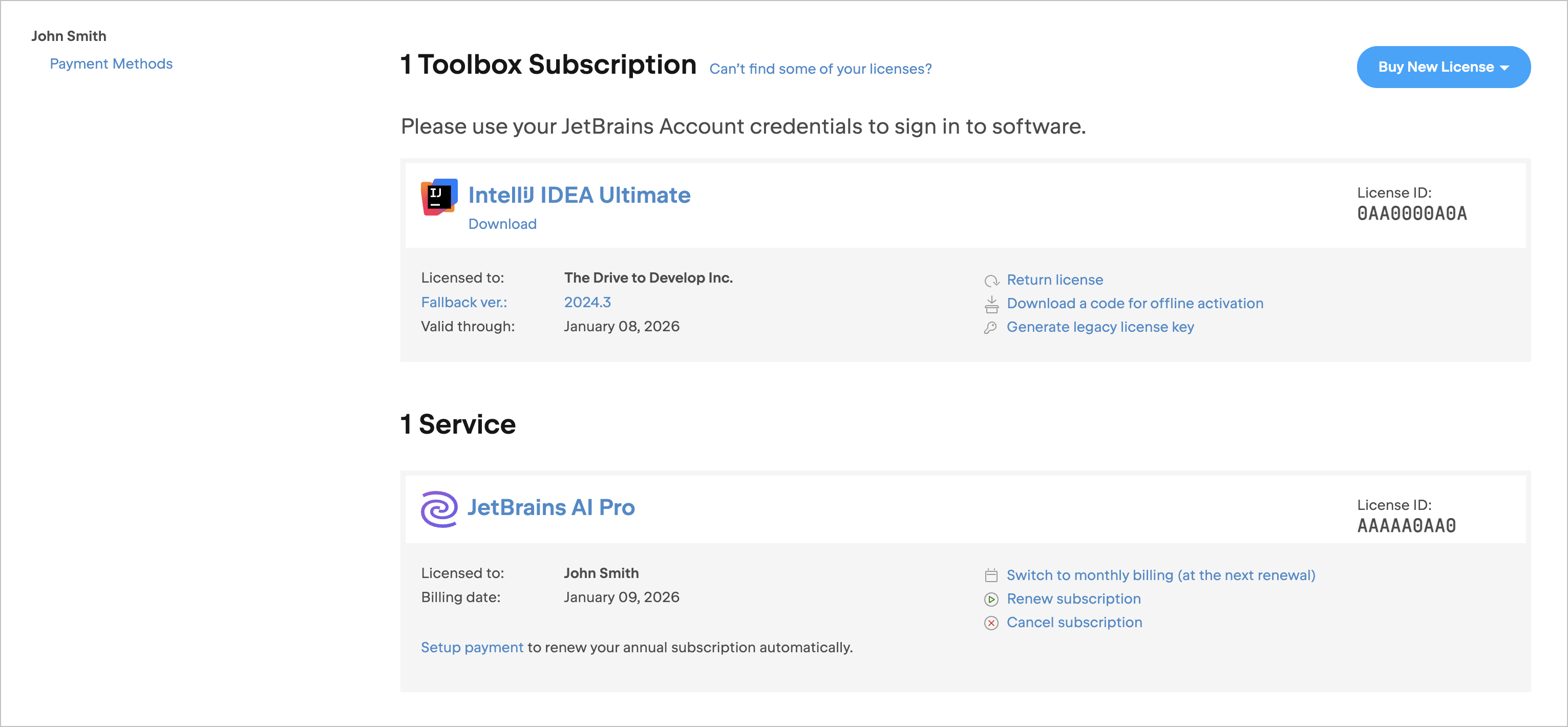 Bien sûr ! Vos licences personnelles et toutes les licences commerciales qui vous sont attribuées par un administrateur d’organisation peuvent être associées au même compte JetBrains. Toutes les licences associées à votre compte sont répertoriées sur la page principale du compte. Pour les activer, connectez-vous à votre logiciel JetBrains à l’aide de votre compte.