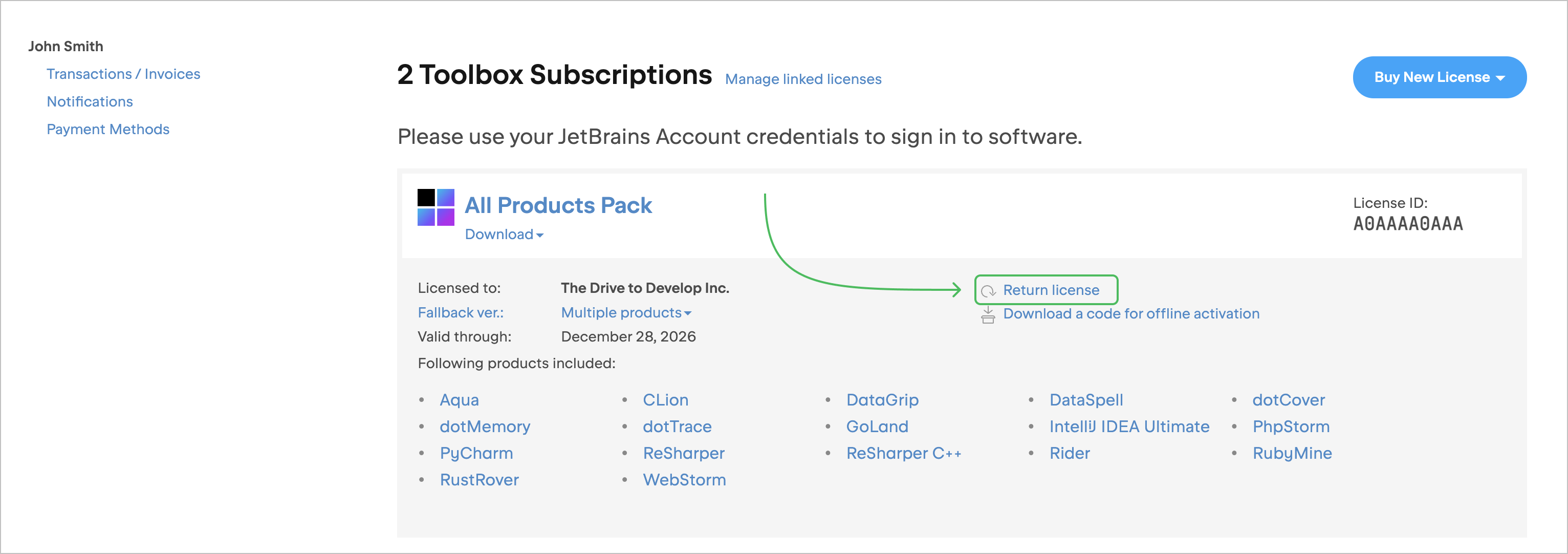 Organization 管理者から JetBrains ライセンスを割り当てられており、そのライセンスが不要になった場合は、他のチームメンバーが使用できるようにそれを返却できます。 次のように行ってください。