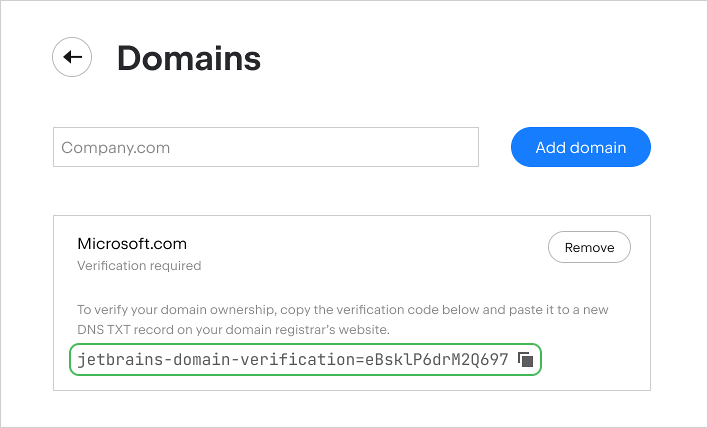 O processo de adicionar um domínio verificado à sua empresa tem duas etapas. Primeiro, você adiciona o domínio ao perfil da sua empresa. Depois, confirma sua propriedade.
