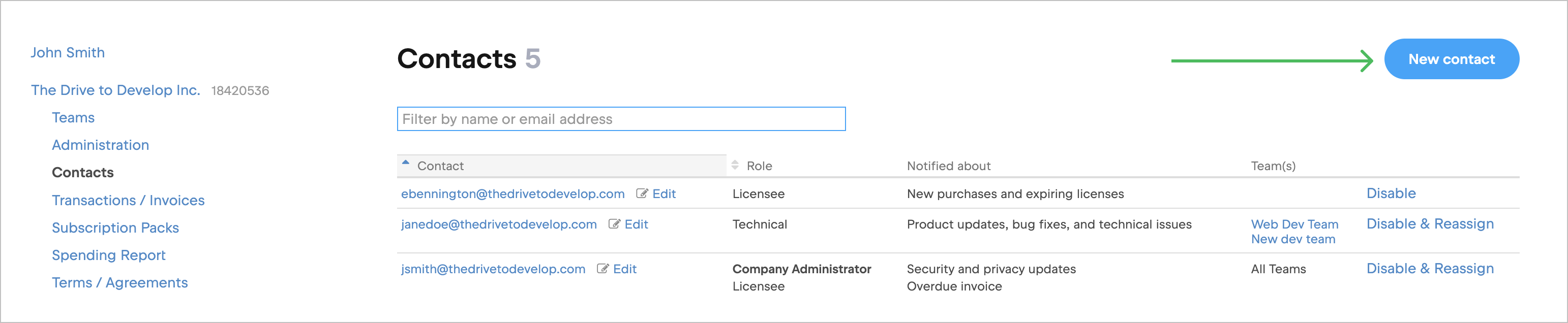 新增至組織 JetBrains Account 的聯絡人會收到這個組織 JetBrains 產品和授權相關的通知。 根據角色,聯絡人也可以存取帳戶的某些區域。 要了解有關聯絡人角色的更多信息,請參閱 Contacts (聯絡人)。