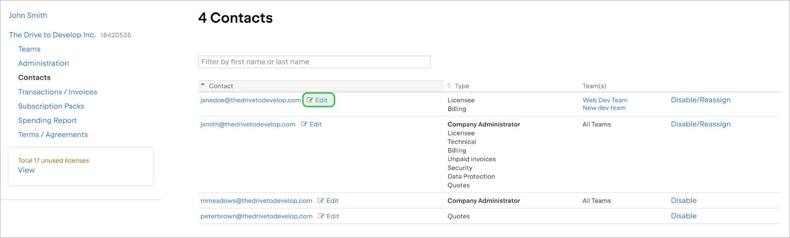 - 根據聯絡人的目前角色,您會在聯絡人表的最後一列看到 Disable (停用)或 Disable/Reassign (停用/重新指派)按鈕。 點擊按鈕。