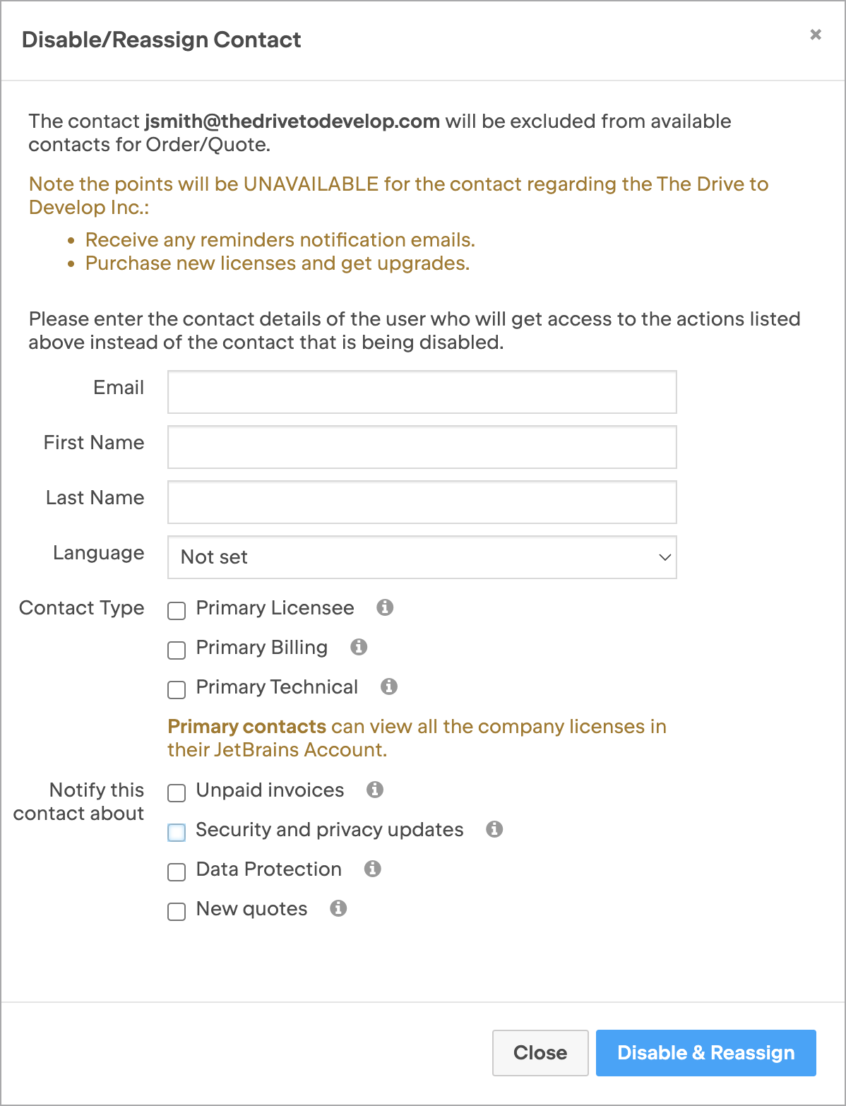 - 您可以停用現有聯絡人,並將其角色重新指派給原本不在聯絡人清單中的新聯絡人。