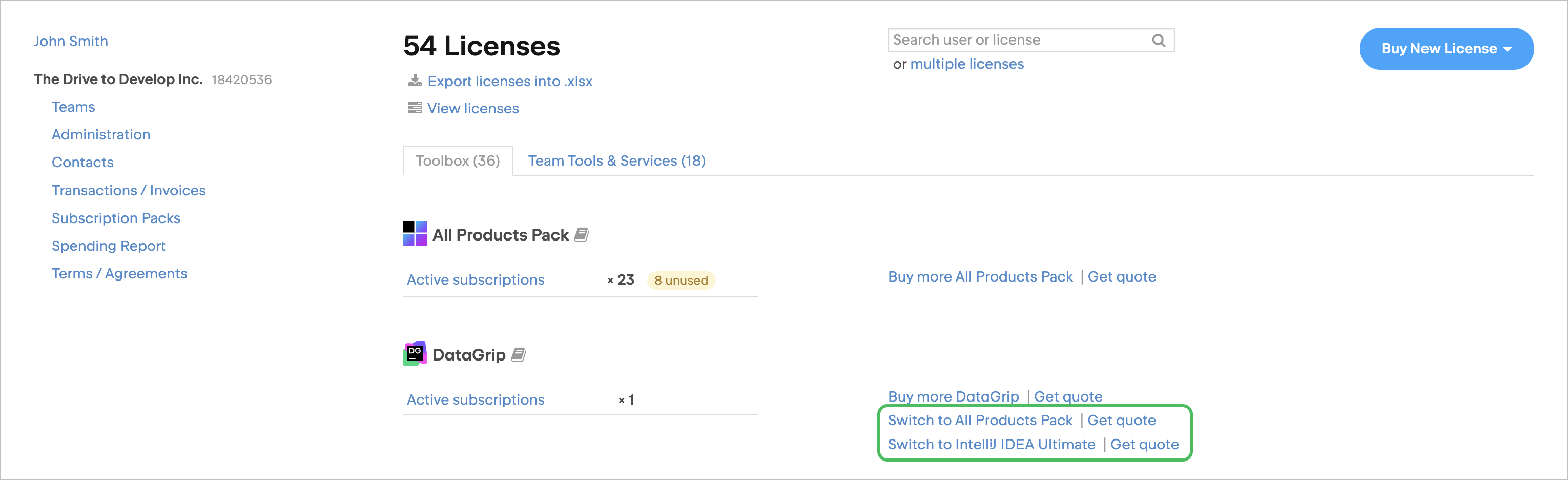 如果您已訂閱單一 IDE 或 .NET 工具,可以升級為包含該 IDE 或 .NET 工具的套裝組合:All Products Pack(適用於 IDE)或 dotUltimate(適用於 .NET 工具)。 您也可以從捆綁包降級為單一工具。